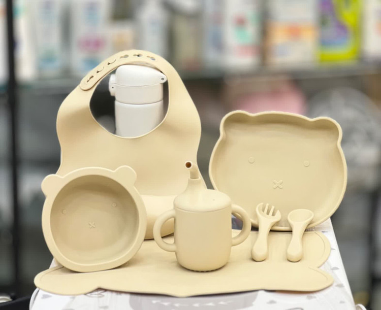 ست ظرف غذای سیلیکونی کودک 7 تکه طرح خرس با پایه های چسبی که دارد بر روی میز میچسبد و از ریختن غذاها حیبن خوردن کودک جلوگیری می شود.