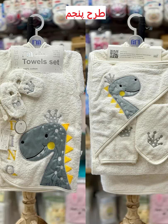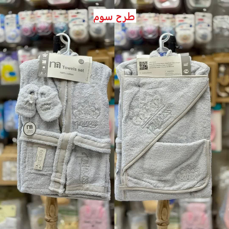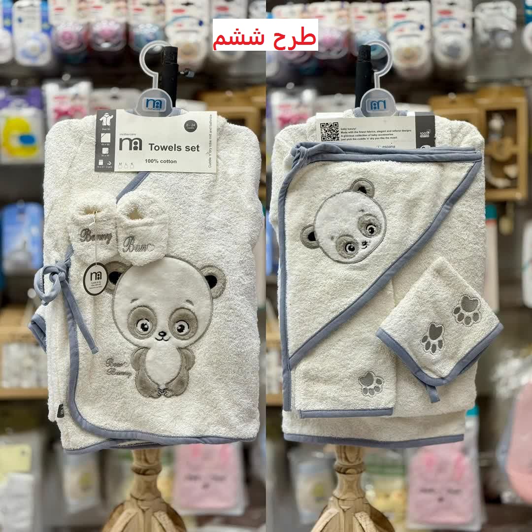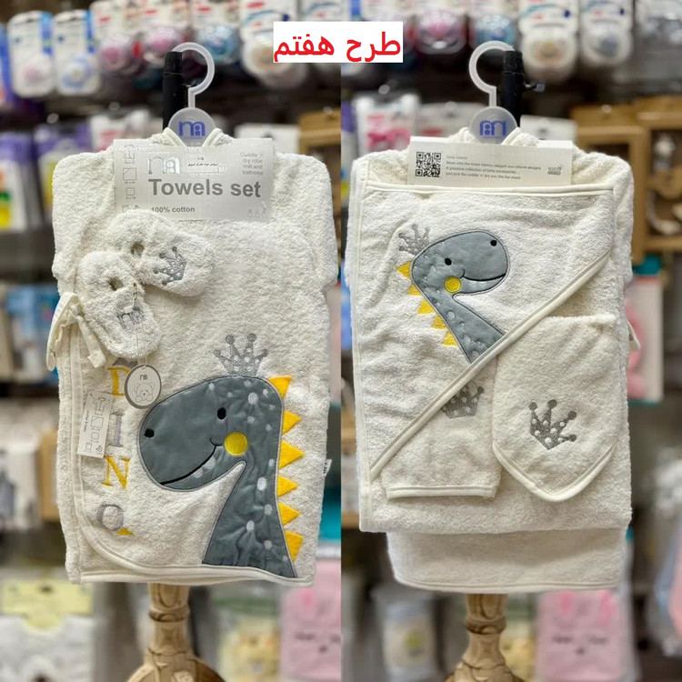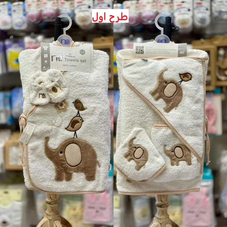 این ست شامل حوله تن پوش، حوله دورپیچ کلاه دار، لیف و یک جفت پاپوش نوزادی است.
