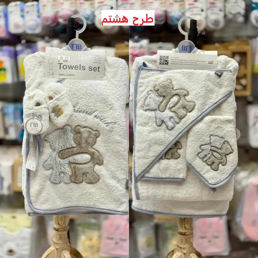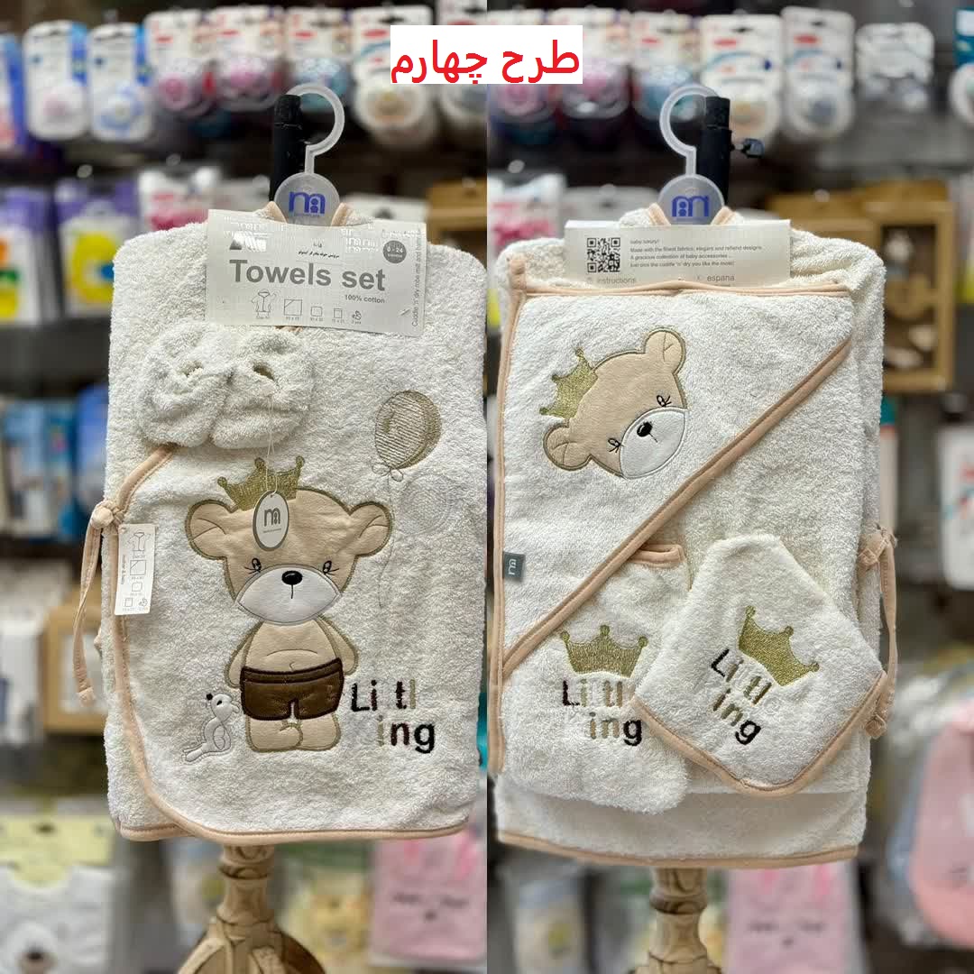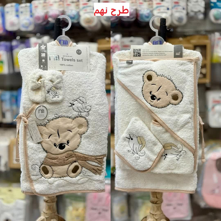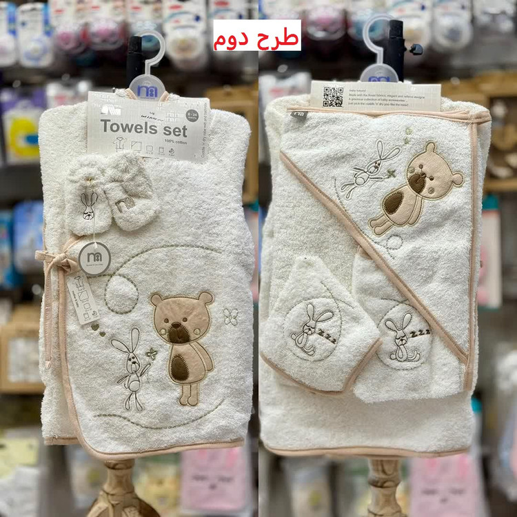 این ست شامل حوله تن پوش، حوله دورپیچ کلاه دار، لیف و یک جفت پاپوش نوزادی است.