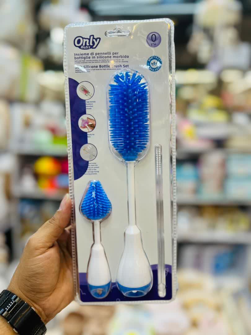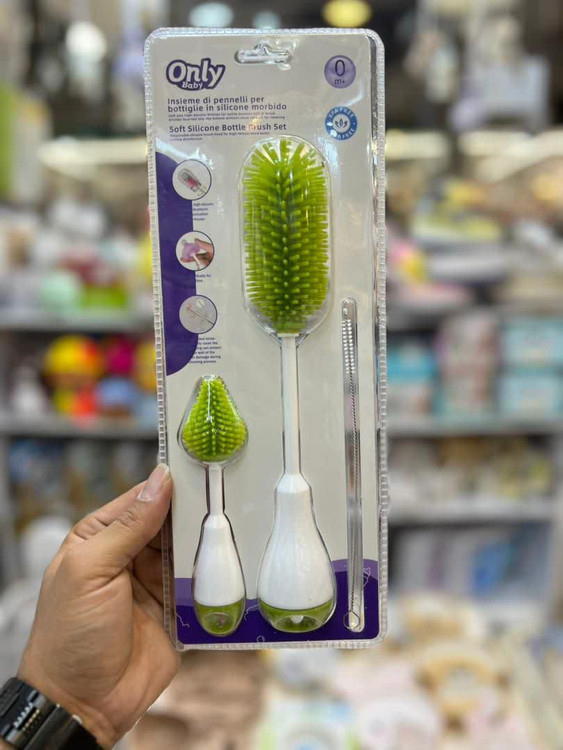 دستهی ست برس سیلیکونی شیشه شور نوزاد اونلی بیبی از پلاستیک فشرده و ضدلغزش ساخته شده تا هنگام شستوشو، کنترل کامل در دست مادر باقی بماند.